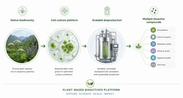 Our platform enables the transition from extraction-based sourcing to controlled biotechnological production, allowing bioactive compounds to be produced independently of geography, climate, or seasonal variability.